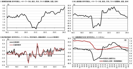 - 2024年3月のアルバイト・パートの募集賃金指数の前年同期比は先月から引き続き上昇し+3.7%となった。