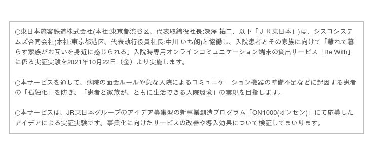患者が入院生活を送る中で、病院の面会ルールや、急な入院によるコミュニケーション機器の準備不足などが引き起こす患者の孤独化の解消や、患者の様子が把握できないことで感じる家族のストレスを軽減することを目的として、入院時専用のオンラインコミュニケーション端末の貸出サービス「Be With」の実証実験を実施します。本サービスでは、患者や家族の好きな時間にオンラインでコミュニケーションをとることで、何物にも代え難い家族を、入院時でも「手軽に身近に」感じることができ、「患者と家族が、ともに生活できる入院環境」の実現を目指します。