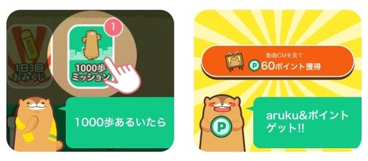 1,000歩歩くごとにaruku&ポイントが獲得できます。ホーム画面の「1000歩ミッション」ボタンをタップすると獲得できます。