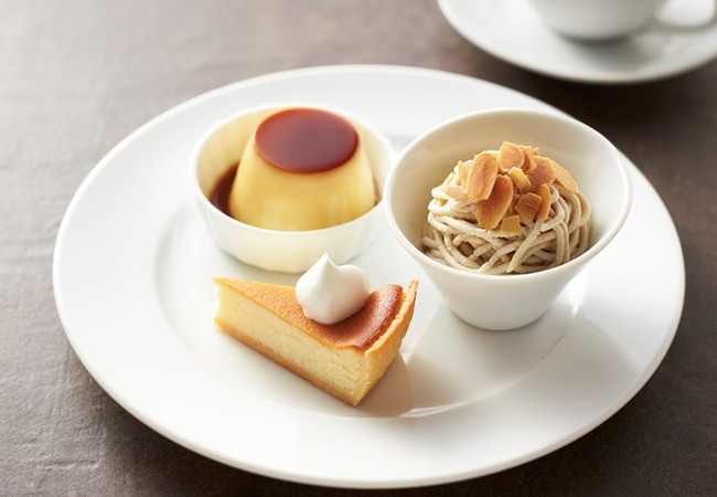 熊本産和栗のモンブランクリームで仕立てたミニパフェ、カスタードプリン(ミニ)、デンマーククリームチーズケーキをワンプレートに盛り合わせました。