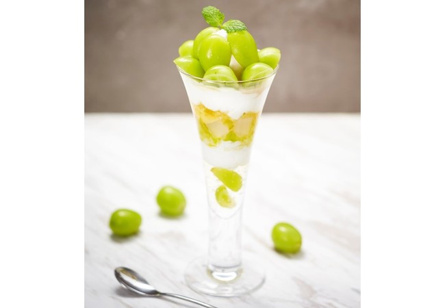 ジューシーで香り豊かな岡山産シャインマスカット「晴王」とカスタードプリン(ミニ)とのマリアージュをお楽しみいただける神戸本店限定メニュー。ヨーグルト風味のアイスと白ワインゼリーでさわやかに仕立てました。 ※なくなり次第終了