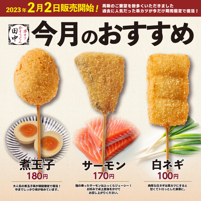 株式会社串カツ田中ホールディングス(本社:東京都品川区東五反田、代表取締役社長:坂本 壽男)は2月2日(木)より、新メニューを販売開始いたします。