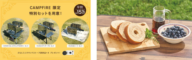今回のリターンは、「LOGOS the ピラミッドTAKIBI L」、「たき火ステンテーブル」、「たき火台シート」がそれぞれセットになった3種類ご用意いたしました。全てのセットに「エコココロゴス・ミニラウンドストーブ」の試供品が付属し、特別価格で購入できます。