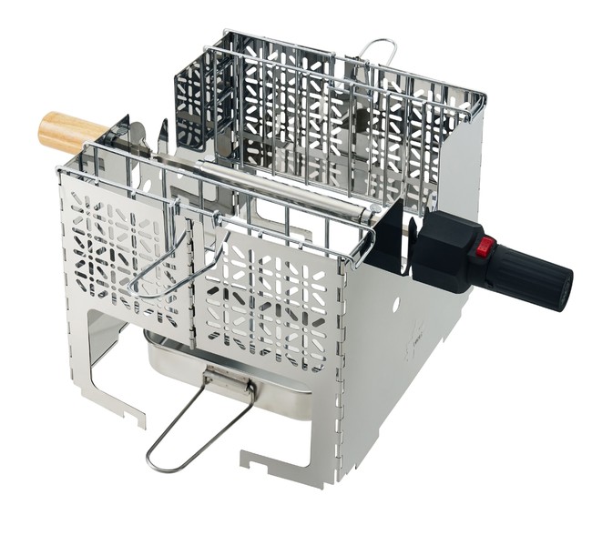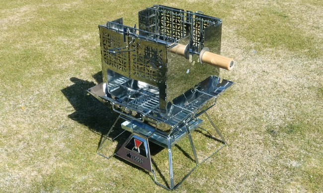付属のスキュアを使用すればシュラスコなども作れるほか、別売りの「炭火サンマ焼き器」を組合せて使用すると魚やイカなども焼けるので、調理の幅が広がる。