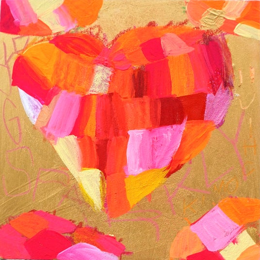 ルビーの気持ち。同じ赤でも、泰介は数十種類の赤を使って描きます。大好きな、いろんな赤の表現の中に、黄色が顔を出したりしているところが、泰介の作品らしい。いつも絵が完成に近づくと、画面のどこかに必ずハートを描き入れます。