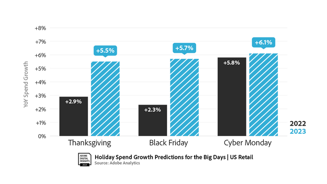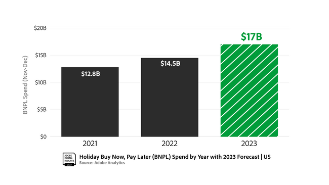 柔軟性の高い後払い決済の利用が寄与し、今シーズンのオンライン売上高は170億ドル(前年比16.9%増、昨年比25億ドル増)に達すると予想されます。アドビは、11月のオンラインの後払い決済額は93億ドルに達し、過去最大の月となると見込んでいます。サイバーマンデーの決済額は7億8,200万ドルで、2022年のサイバーマンデーの1日の記録である6億5,800万ドルを上回り、オンライン後払い決済にとって最大の日となるでしょう。