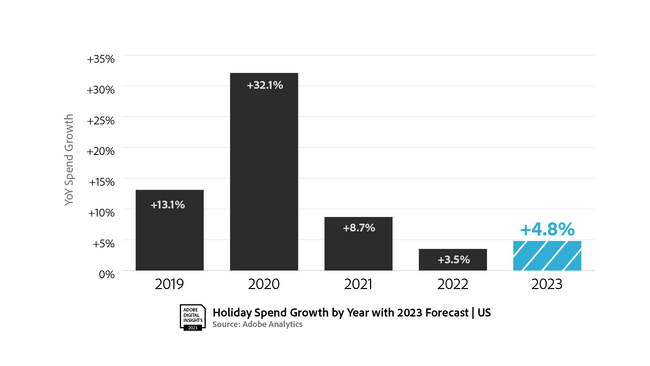 アドビ(Nasdaq: ADBE)(本社:米国カリフォルニア州サンノゼ、以下アドビ)は本日、2023年ホリデーシーズン(11月1日から12月31日まで)のオンラインショッピング予測を発表しました。これはアドビの分析ソリューション「Adobe Analytics(https://business.adobe.com/jp/products/analytics/adobe-analytics.html)」を通じて得られたオンラインでの商取引データからEコマースの状況を示す最も包括的な分析で、米国の小売サイトへの1兆回以上の訪問、1億個のSKU、18の製品カテゴリーから得られたデータに基づいています。Adobe AnalyticsはAdobe Experience Cloud(https://business.adobe.com/jp/)の一部であり、米国のインターネット小売業者上位100社*の85%以上が、オンラインでのショッピング体験の提供、測定、パーソナライゼーションを行うためにこのソリューションを利用しています。