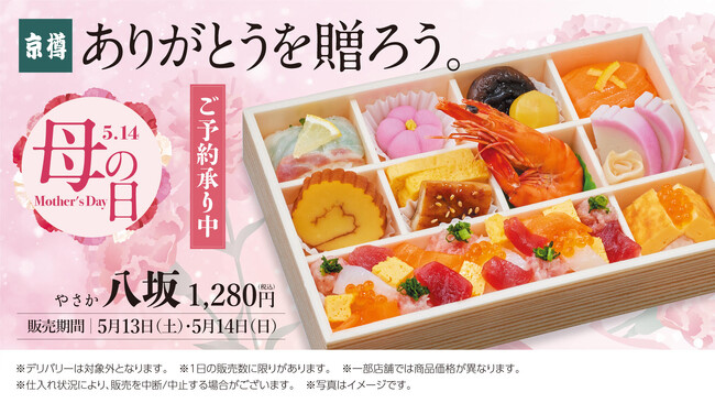 株式会社 京樽(本社:東京都中央区、代表取締役社長:堀江 陽)は、お持ち帰り鮨専門店「京樽」にて、5月13日(土)・14日(日)の2日間限定で販売する母の日限定商品「八坂」の予約を、4月14日(金)より開始いたします。