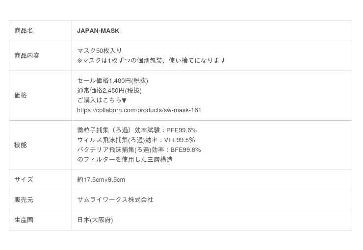 サムライワークス株式会社(代表取締役社長:新島 実 本社所在地:東京都渋谷区)は、今日の感染者の増加の現状を受け、少しでも感染者減少に貢献したいという思いで、医療用レベルのウイルス捕集力を持つ高性能なマスク『JAPAN-MASK』を通常価格2,980円から特別価格1,480円に値下げして追加販売を開始いたします。また、【2万枚限定】平日正午12時までのご注文に限り即日出荷で発送スタート!