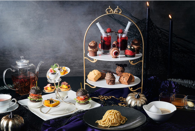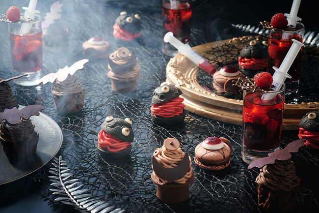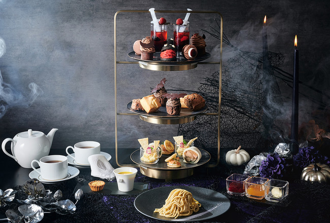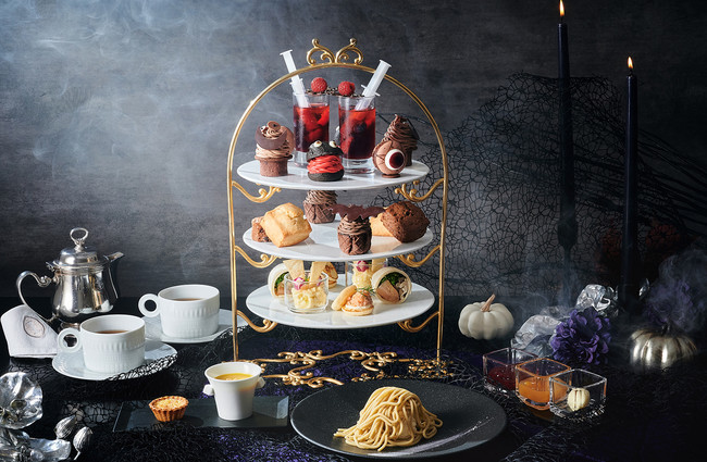ハロウィン期間限定で、オバケたちがモンブランに変身した4種のモンブランの食べ比べを満喫できる、至極のモンブランづくしのアフタヌーンティーをお届けします。プティガトーは、別皿で和栗の風味豊かな味わいが楽しめるしぼりたてモンブランのほか、フランス栗を使ったモンブランや甘酸っぱさが口に広がるフランボワーズのシュー仕立てのモンブラン、チョコレートのモンブランをラインナップ。さらに、目玉オバケのマカロン、フランボワーズの赤をアクセントにして血糊を表現したグレープゼリーを揃えました。