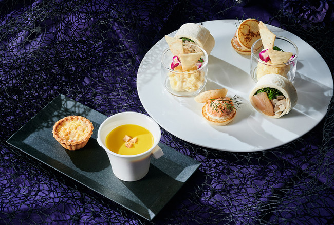 ホテルメイドのスコーンはプレーンとチョコレート風味をクロテッドクリーム、フランボワーズジャムとマーマレードを添えて提供いたします。セイボリーは、照焼チキンとキノコや野菜がぎっしり詰まったトルティーヤロール、甘味と塩味が合わさった栗とベーコンのキッシュ、さつまいもサラダとクリームチーズのディップや、相性抜群のスモークサーモンとサワークリームをサンドしたミニパンケーキを、隣接するフレンチレストランから秋を感じていただける本格的な味わいをお届けいたします。