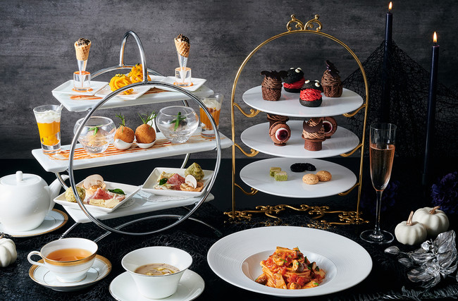 乾杯酒、ハイティースタイルオードブル、スープ、選べるパスタ、アフタヌーンティースタイルデザート(目玉チョコレートマカロン、フランス栗のへんてこモンスターモンブラン、こうもりのチョコレートモンブラン、おかしな3つ目のシューモンブラン、プティフール各種) 、ハーブティーまたは コーヒー、紅茶など(10種類)