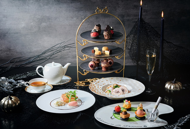 前菜2品、メインディッシュ、アフタヌーンティースタイルデザート(目玉チョコレートマカロン、フランス栗のへんてこモンスターモンブラン、こうもりのチョコレートモンブラン、おかしな3つ目のシューモンブラン、プティフール各種) 、ハーブティーまたは コーヒー、紅茶など(10種)
