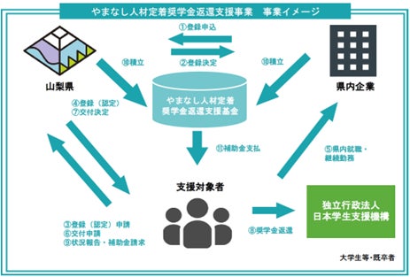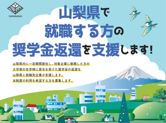 山梨県(知事:長崎幸太郎)では、若年層の人材確保・定着とUIターン就職の促進及び人口減少対策の一層の充実を図り、県内企業の持続的な成長につなげるため、県内に就職する大学生等の奨学金返還を支援する「やまなし人材定着奨学金返還支援制度」を実施しております。