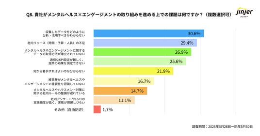 メンタルヘルス×エンゲージメントの取り組みを進める上での課題は、「収集したデータをどのように分析・活用すべきかわからない」が最多