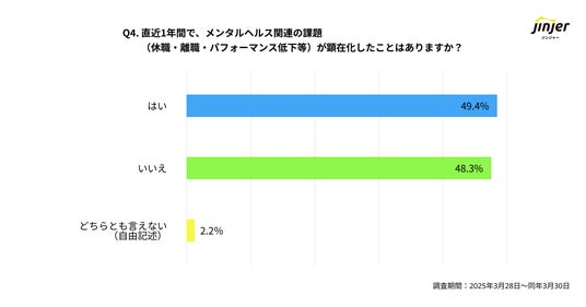 メンタルヘルス関連の課題(休職・離職など)が顕在化している企業は、約半数存在