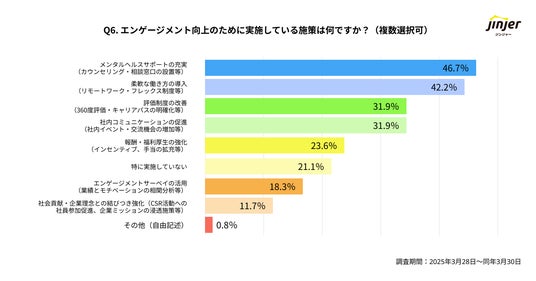 エンゲージメント向上のために実施中の施策は、「メンタルヘルスサポートの充実」が最多