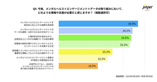次いで、「メンタルヘルスとエンゲージメントのデータを連携・分析するための手法やツール」、「心理的安全性を高めながら、生産性向上につながる組織づくりの成功事例」という結果でした。
