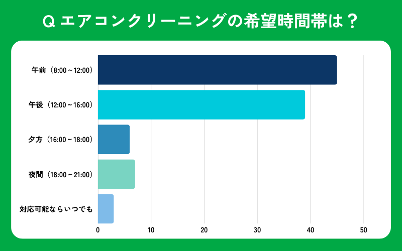 ・エアコンクリーニングの作業を8時~16時までの間に希望する人が8割以上。