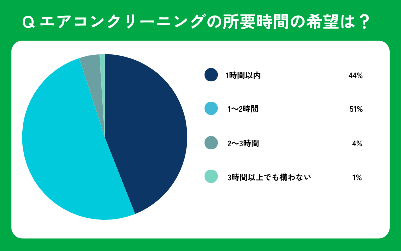 ・95%の人がエアコンクリーニングの作業はだいたい2時間以内で完了させてほしいと希望している。