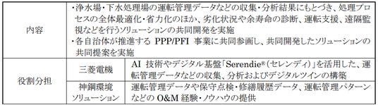上下水道事業において、三菱電機は浄水場・下水処理場などの監視制御設備や受変電設備などの電気設備、神鋼環境ソリューションは浄水場における生物処理や下水処理場における汚泥の消化、燃料化などの脱炭素に繋がる機械設備の開発・設計・建設・保守点検・修繕などを行っています。