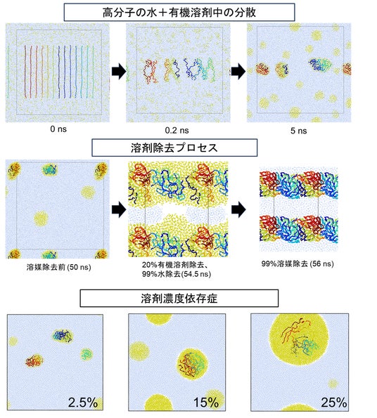 - 水と有機溶剤の二成分系では、相分離が高分子の局所凝集を誘発すること、また溶媒蒸発過程では高分子-溶媒相互作用の強さが凝集の進行を左右することを示しました。