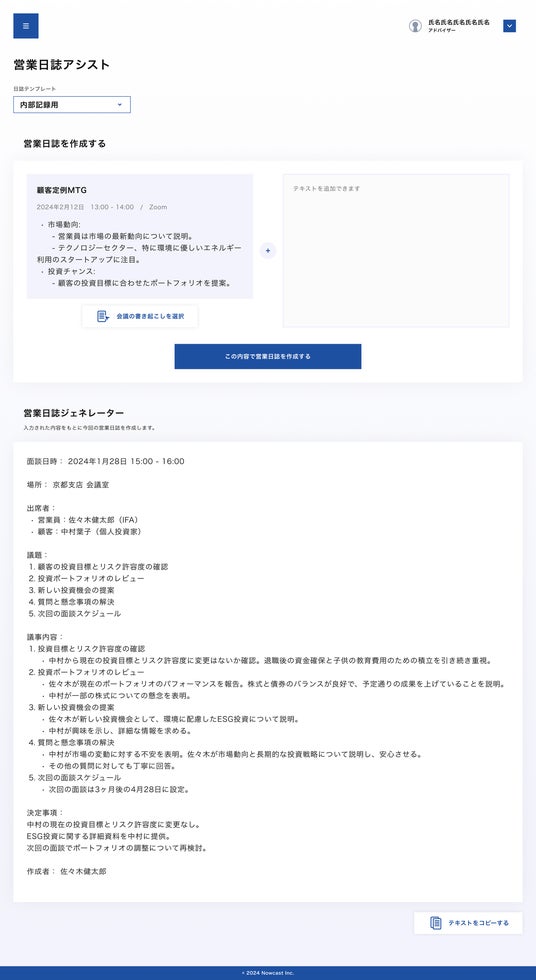 次世代金融インフラの提供を通して組込型金融を実現するFinatextグループの株式会社ナウキャスト(本社:東京都千代田区、代表取締役CEO:辻中 仁士、以下「ナウキャスト」)は、ファイナンシャルアドバイザリー業務の効率化を生成AIで支援する「Finatext Advisory Assist(フィナテキスト・アドバイザリー・アシスト)」の提供を本日2024年4月19日(金)から開始します。なお、IFAのファイナンシャルスタンダード株式会社(本社:東京都千代田区、代表取締役:福田 猛、以下「ファイナンシャルスタンダード」)が本サービスの導入を決定しています。
