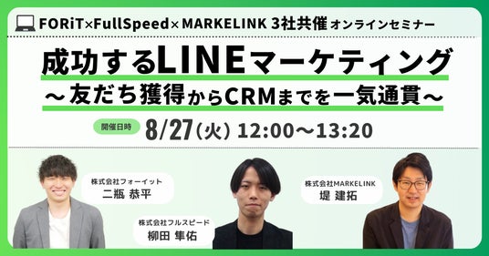 パフォーマンステクノロジーネットワーク「afb(アフィビー)」< https://www.afi-b.com/ >の開発運用をおこなう株式会社フルスピードは、株式会社フォーイットと株式会社MARKELINKと共に、「成功するLINEマーケティング ~友だち獲得からCRMまでを一気通貫~ 」と題したオンラインセミナーを、2024年8月27日(火)に開催いたします。