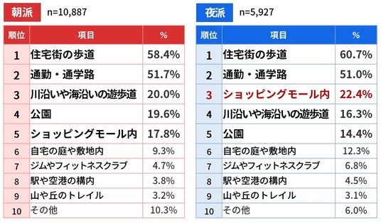 3位には「ショッピングモール内」(19.4%)がランクインしました。昨今、季節や天候に左右されずに快適にウォーキングができる場として、館内をウォーキングコースとして開放しているショッピングモールも増えてきました。夜派の3位(22.4%)にもランクインしており、買い物ついでに夜間でも明るい場所で安全にウォーキングを楽しめる場所のようです。