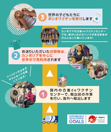 ご家庭で使用しなくなった衣料品を回収し、外国で販売することで、ポリオワクチンを必要とする世界の子どもたちにワクチンを寄付できる取り組みです。