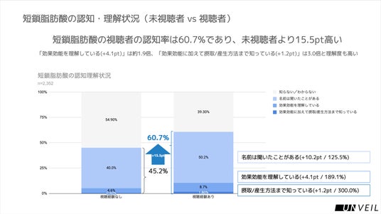 アンベールによる3ヶ月間の情報配信の結果、短鎖脂肪酸の「認知度」および「理解度」の双方において顕著な向上が認められました。特に成分の効果効能に対する理解度は約1.9倍となり、さらに体内への摂取および産生方法についても非視聴者に対して3倍の数値となりました。