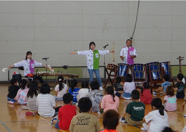 児童たちは、演奏が始まると身を乗り出してリズムを取ったり、演奏体験では戸惑いながらも全身を使って元気よく和太鼓を叩いたりしていました。