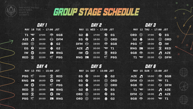 MSI 2022 のグループステージでは、11の地域が3つのグループに分けられ対戦します。各グループの出場チームと対戦日程は以下の通りとなります。※表記:チーム名(略称)
