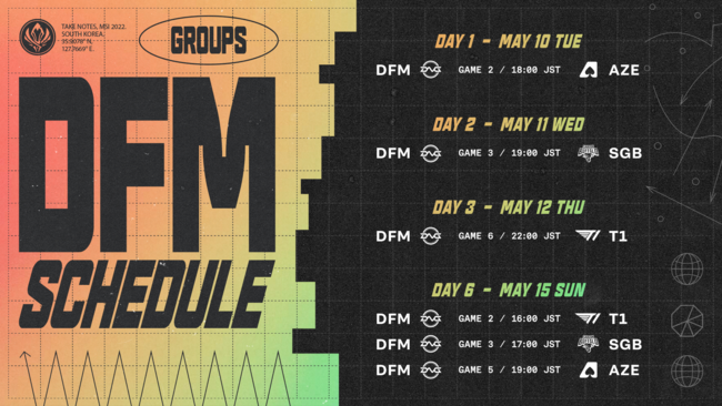 「MSI 2022」は、全試合を日本語の実況解説付きで放送します。DetonatioN FocusMe の試合は以下のスケジュールで放送されます。(試合の状況により、開始時間は多少前後する可能性がございます)