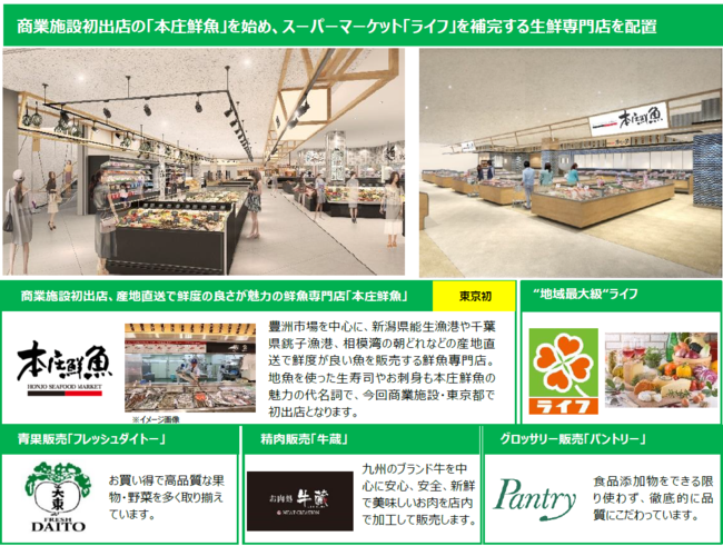 エリアNo1の面積を誇るスーパーマーケット「ライフ」に加え、専門性の高い青果「フレッシュダイトー」、商業施設初出店の鮮魚「本庄鮮魚」、精肉「牛蔵」の生鮮三品と、総合グロッサリー「パントリー」を誘致し、お客様の幅広いニーズに応えます。