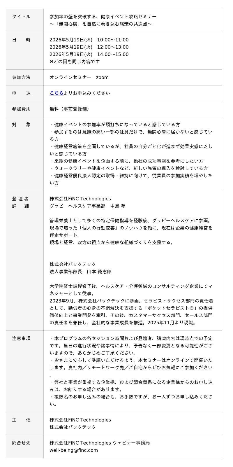 本セミナーでは、それぞれ異なるアプローチで数多くの企業の健康施策を支援してきたFiNC Technologiesとバックテックの2社が、現場で蓄積してきた知見を持ち寄り、「無関心層を自然に巻き込む施策にはどんな共通点があるのか」を紐解きます。