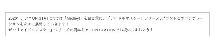 尚、アニON STATIONでは現在「アイドルマスター」シリーズ15周年を祝して「Medley! in anion station 2020(メドレー イン アニオン ステーション)」※1を実施中です。