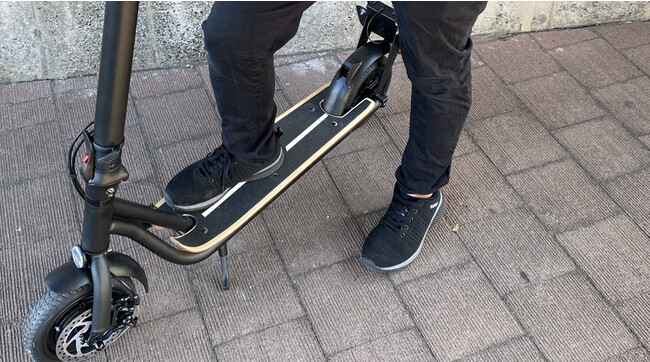 他の電動キックボードとは趣の異なる、スケートボードと同じウッドデッキを採用したスタイリッシュなデザイン。