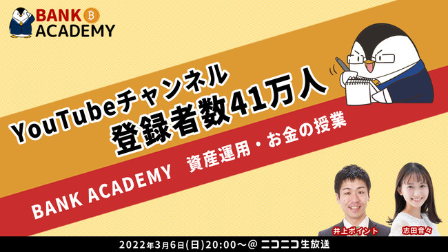 3月6日(日)20時よりニコニコ生放送でチャンネル登録者数41万人の大人気資産運用YouTubeチャンネル「BANK ACADEMY」小林亮平さんをお招きし、初めての方向けに資産運用/お金の授業を行います!