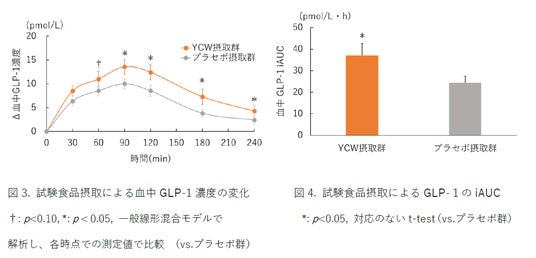 YCW摂取群はプラセボ摂取群と比べて摂取60分後から増加傾向を示し、90分から240分の間でGLP-1分泌量が有意に増加することが明らかとなりました(図3)。また、摂取直後から摂取終了時までの総GLP-1分泌量を比較するために、上昇曲線化面積(Incremental Area Under the Curve: iAUC)を算出したところ、YCW摂取群はプラセボ摂取群と比べて有意に高くなることがわかりました(図4)。