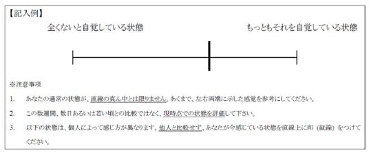 各項目(例:満腹感)に対して、左端を「全くないと自覚している状態」、右端を「もっともそれを自覚している状態」として、直線状に印をつけて、その長さで感情を評価する方法。