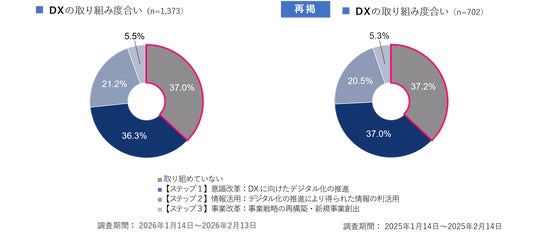 前年同時期に実施した調査結果と比較すると、【ステップ1】はマイナス0.7ポイント、【ステップ2】はプラス0.7ポイント、【ステップ3】はプラス0.2ポイントという結果でした。DXの取り組み度合いについても、全体として前年から大きな変化は見られませんが、ステップ2およびステップ3の割合がわずかに増加しており、取り組みの深化に向けた動きが一部で見られます。