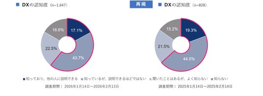 ・ DXの認知度について「知っているが、説明できるほどではない」(43.7%)と「知っており、他の人に説明できる」(17.1%)を合わせると約6割の企業がDXについて認知していることが判明しました。