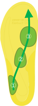 1.踵部外側、2.足裏アーチ中(第三中足骨基部)、3.母趾球にパッドを配置。