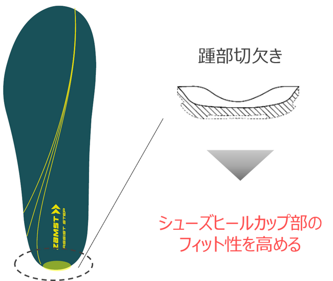 インソール表側へ入れているエッジ(切欠き)により、シューズと足の隙間が少なくなり、シューズとの一体感を高める。