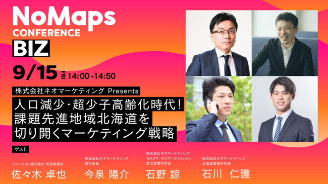 カンファレンスでは「人口減少・超少子高齢化時代!課題先進地域北海道を切り開くマーケティング戦略」といったテーマで、フュージョン株式会社 佐々木代表取締役と、弊社執行役員の今泉、東北営業所所長の石野、北海道営業所所長の石川が、約1時間登壇いたします。