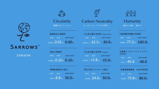 株式会社ユナイテッドアローズ(代表取締役 社長執行役員 CEO: 松崎 善則、本社所在地:東京都渋谷区)は、サステナビリティ活動のスローガン「SARROWS(サローズ)」のもと、2022年8月に、2030年に向けた3つの活動目標:「Circularity(循環するファッション)」、「Carbon Neutrality(カーボンニュートラルな世界へ)」、「Humanity(健やかに働く、暮らす)」を掲げ、各種活動を推進しています。2024年4月~2025年3月までの主な活動と数値目標に対する実績をご報告いたします。