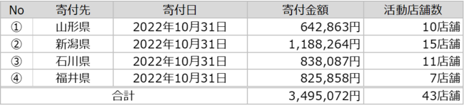 この度の支援活動は、2022年4月1日から9月30日の期間、山形県、新潟県、石川県、福井県のダイナム 43店舗に来店されたお客様にご協力いただいた玉・メダル相当額を4県へと寄付いたしました。
