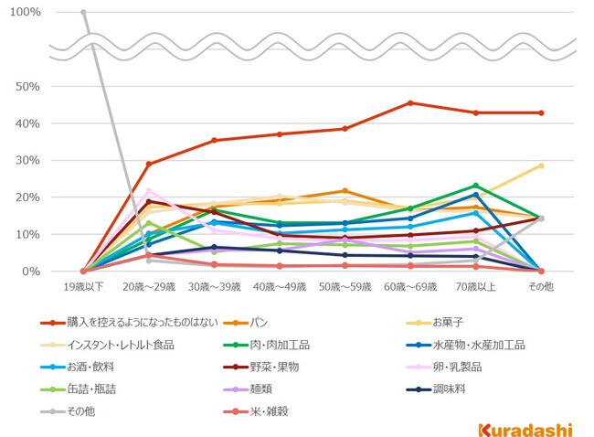「購入を控えるようになったものはない」と回答した方の割合は、20歳~29歳では29.0%、60歳~69歳では45.5%となっており、年代が上がるにつれて割合が増加する傾向が見られます。また、20歳~29歳で「卵・乳製品」、40歳~49歳で「インスタント・レトルト食品」、50歳~59歳で「パン」、70歳以上で「肉・肉加工品」「水産物・水産加工品」の購入を控えるようになったと回答した方の割合が20%を超えています。