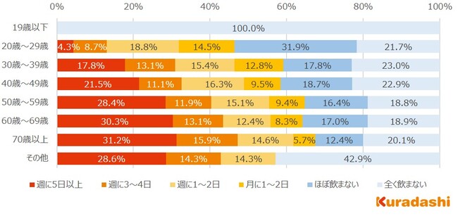 19歳以下とその他を除くと、「週に5日以上」と回答した方の割合は、70歳以上が最も多く31.2%、そこから年代が下がるにつれて割合は減少し、20歳~29歳が最も少なく4.3%でした。年代が上がるほど、普段自宅でお酒を飲む人が多い傾向にあります。また、20歳~29歳「ほぼ飲まない」と回答した方が31.9%と、他の年代と10%以上の差があることから、若者のお酒離れが進んでいると推察されされます。